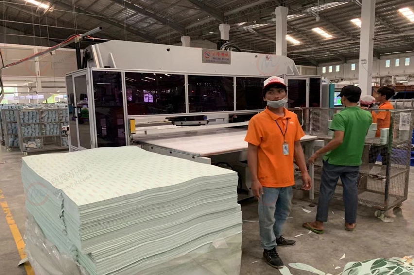 1、設備採用三軸式電腦自動排版,國際領先技術製造,設計合理用於提高產能節省人工,可多卷材料同時裁切(如下图)。
