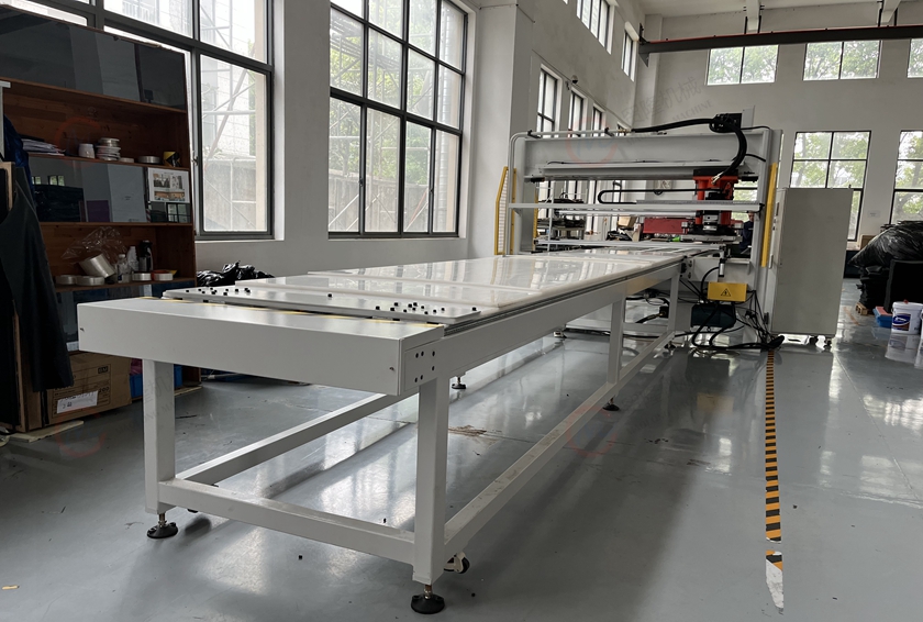 10.输送部分采用日本三菱PLC控制,由伺服电机驱动物料从机器的一面输入,经模切后,从另一面输出,确保送料准确,运行平稳;并且送料长度可以通过触摸屏方便的调整,故障显示信息,方便机器维修。