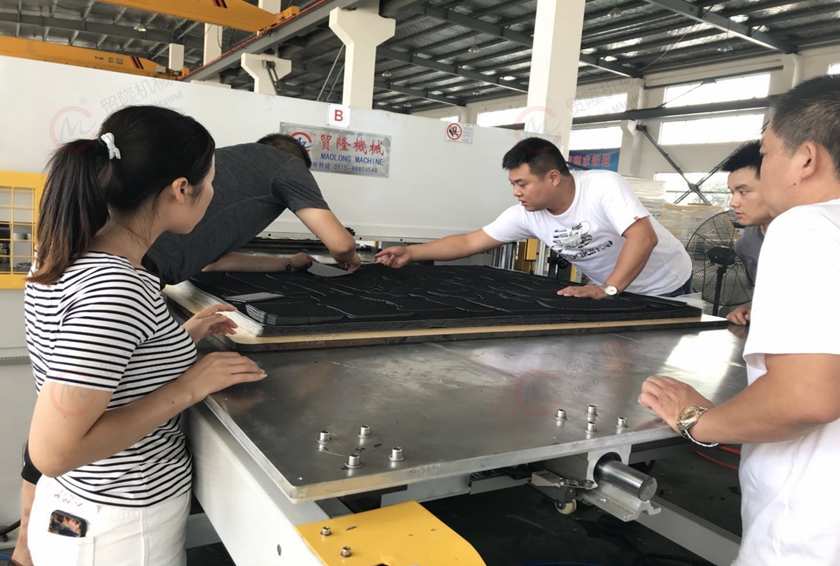 适合发泡材、纸板、纺织物、塑胶材料、皮革、橡胶、包装材料、地板材料、地毯、玻璃纤维、软木等材料之刀模裁断,适合各种产业的裁断作业。本客户是做汽车后排座椅的,一模一整套座椅成品